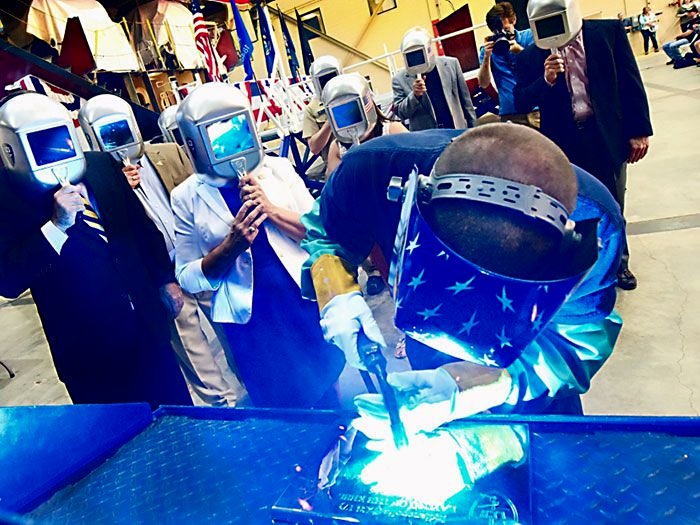 A welder authenticates the keel of LCS 17, the future USS Indianapolis, by welding the initials of ship sponsor Jill Donnelly. The Keel Laying is the formal recognition of the start of the ship’s module construction process.